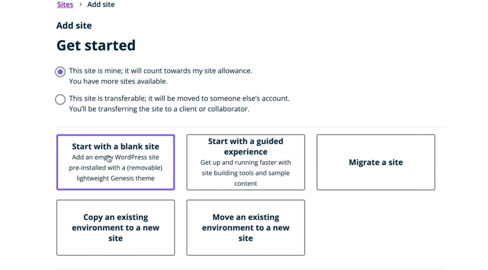 Click on ‘Add a site’ in the top right corner. Next choose ‘Blank site’ and make sure “This site is mine…” is selected.