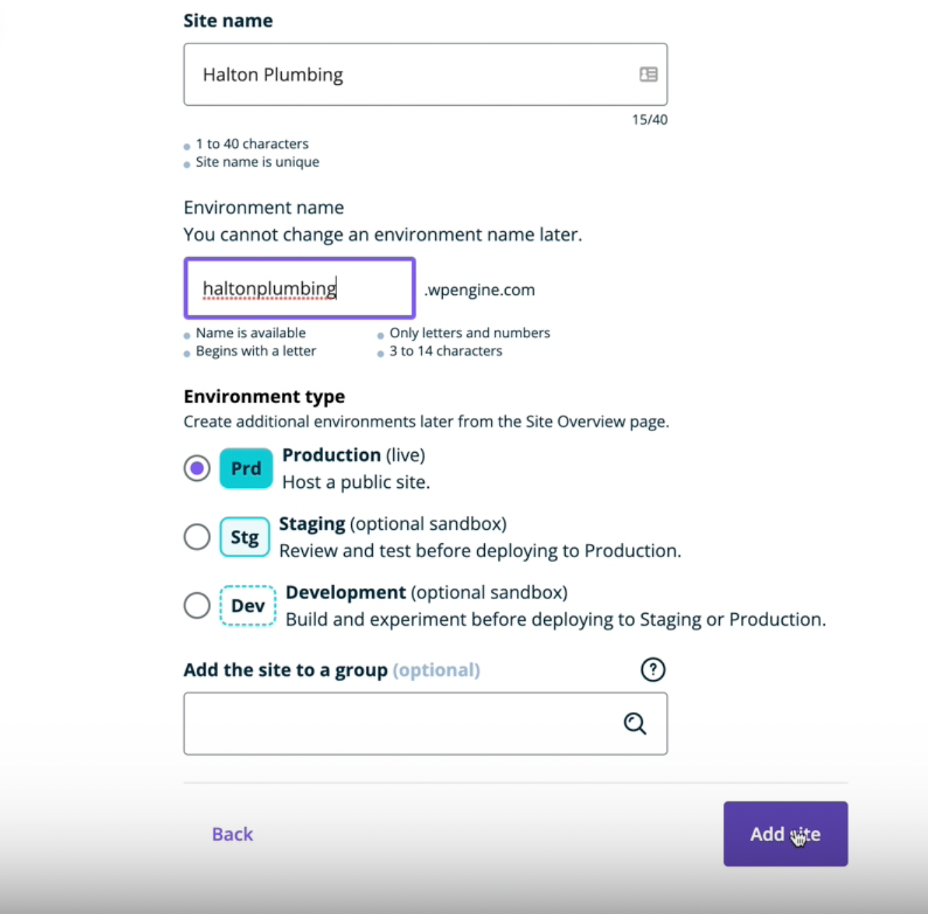 Next you need to create the environment name (3 to 14 characters), for example Halton Plumbing. Then create the instance; you can have up to three instances within a sites (production, staging and development). Lastly, click ‘Add Site’ at the bottom.