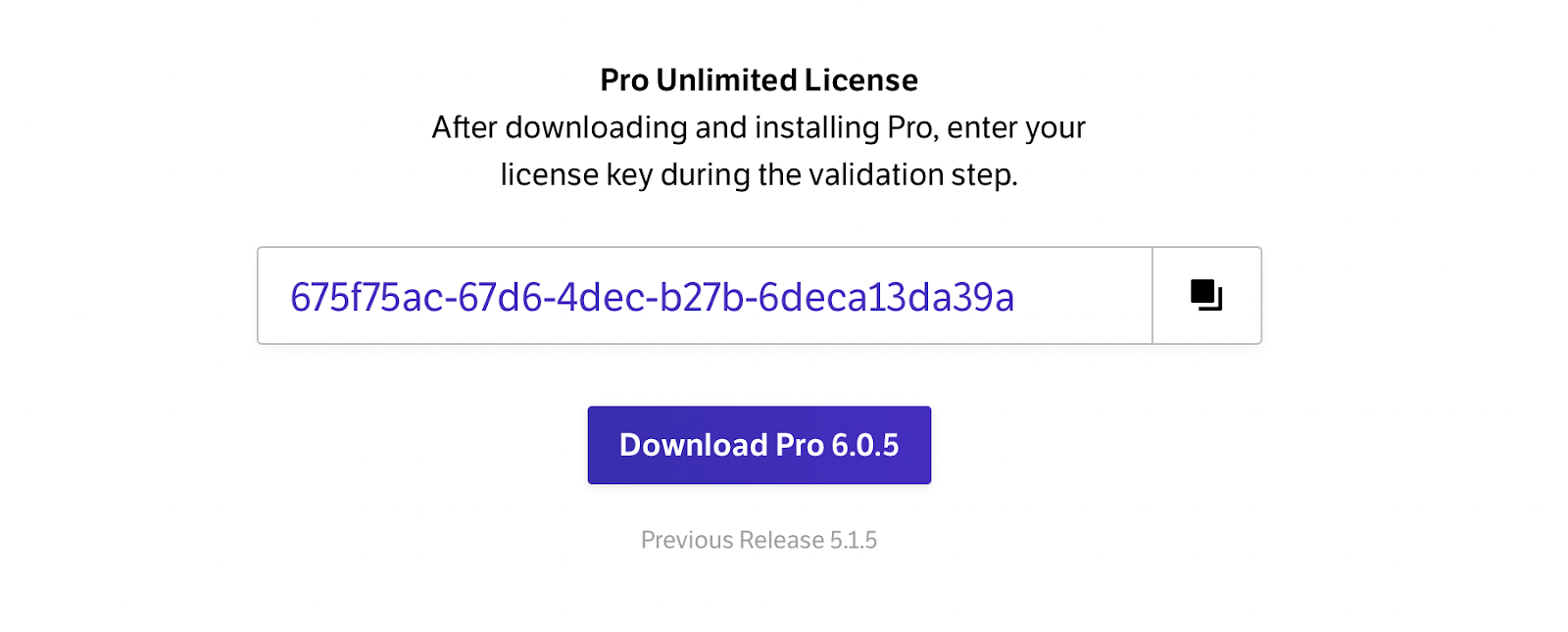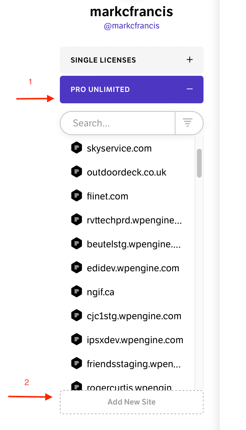 Click on the ‘Pro Unlimited and then click on ‘Add new site’. To the right you will see a license key populate. You will need to copy this for later and download the newest version.