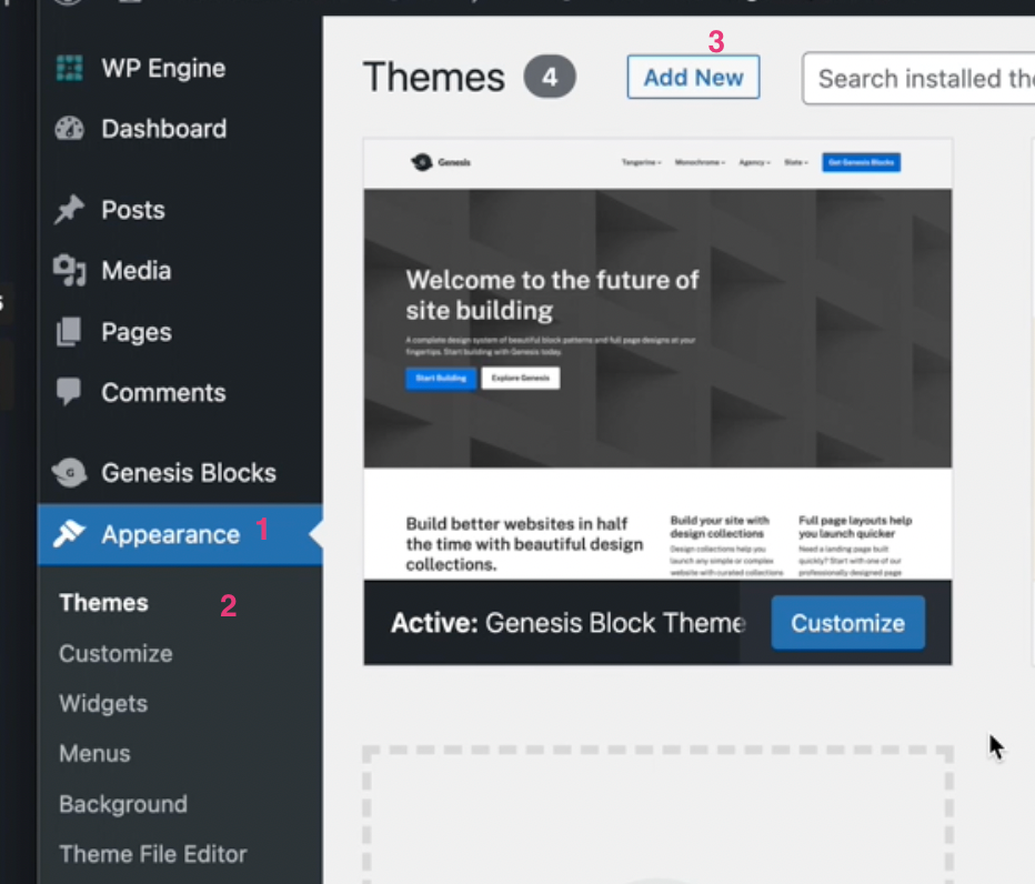 Go back to your instance in WP, go to Appearance in the menu then Themes. Click on Add new: